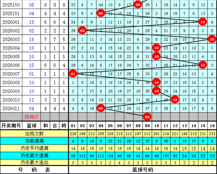 双色球第26011期蓝球开出余数1路、偶数、小 号04,余数1路蓝球间隔1期再次出现。