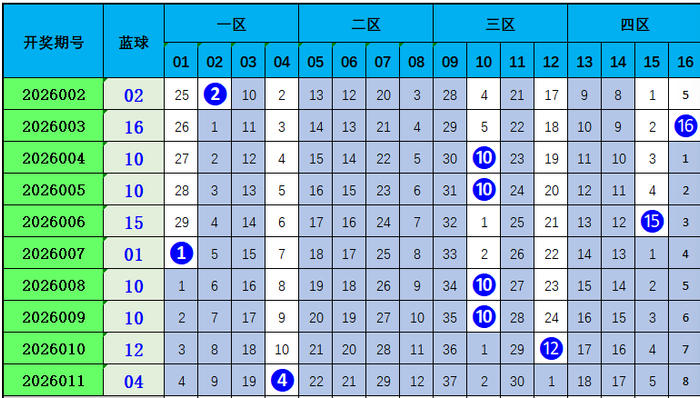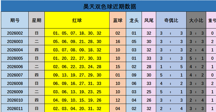 双色球第2026011期开奖:本期开奖号02,03,04,20,31,32。蓝球:04。当期红球号码龙头02,凤尾32,奇偶比为2:4,大小比:3:3。