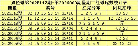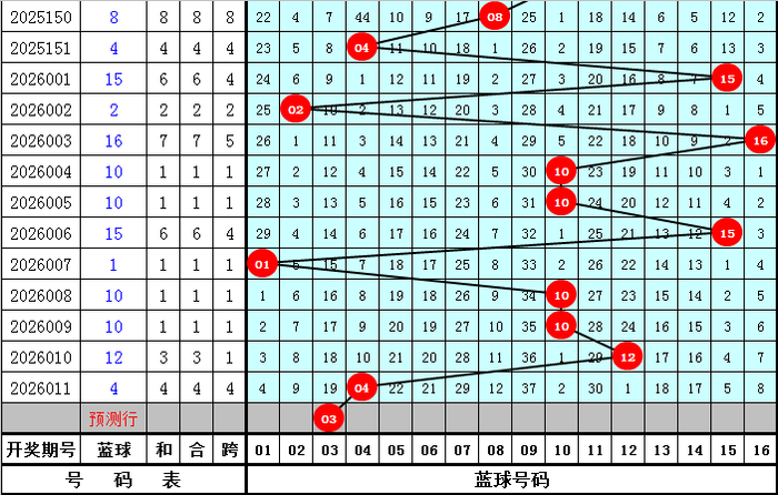蓝球尾数分析:最近7周星期二开出4个蓝球尾数,重复蓝球尾数明显活跃,本周星期二排除近期已出现的蓝球尾数,注意温冷蓝球尾数回补,关注蓝球03。