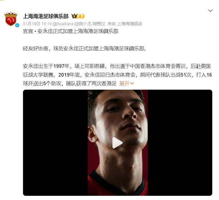 安永佳的加盟,不是终点,而是开始!1月24日U23国足杀进决赛,而安永佳的中超故事,才刚刚拉开序幕!让我们一起期待:这位香港“C罗”,能否在上海海港书写新的传奇?你们认为安永佳加入,让上港整体实力提升几个档次吗?他的加入,让上港在今年夺冠稳了吗?如何看?请把留言打在评论区!