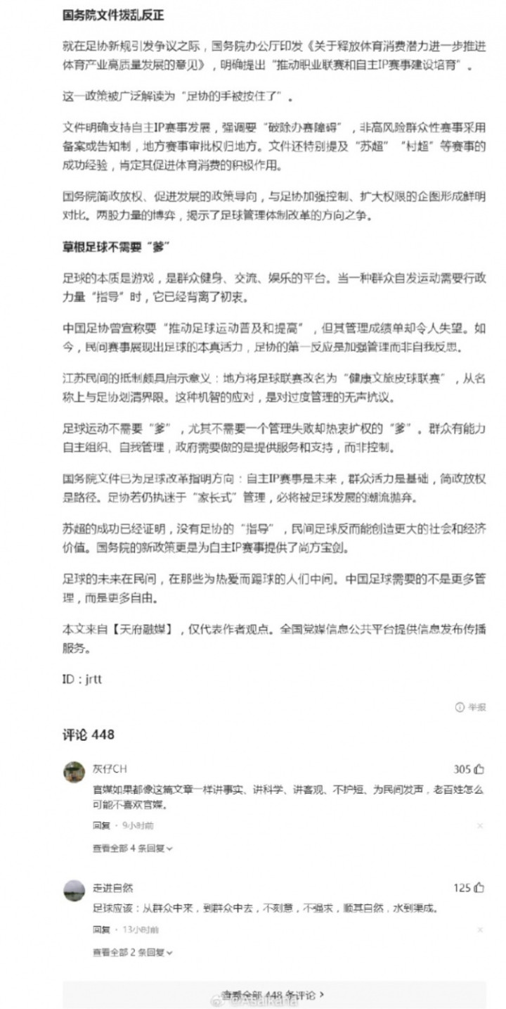令人震惊。由人民日报社运营的头条账号“全国党媒信息公共平台”今日发布了一则来源为“天府融媒”,题为《向中国足协说“不”草根足球不需要“爹”》的文章,该文章引用了澎湃网转载的新华社关于足代会的通稿截图,在明知足代会内容的情况下,其文章主旨与全国足球工作会议和足代会精神完全相悖,曲解国家法律和政策,迎合负面流量,炒作“苏超”和中国足协的对立、业余足球与职业足球的对立。其中内容充斥着各种低级错误,多处引用已被官方辟谣的自媒体创作内容,milansportsAI味十足。文章署名为jrtt,尽管全国党媒信息公共平台声明“本文来自[天府融媒],仅代表作者观点。全国党媒信息公共平台提供信息发布传播服务”,但从评论区情况看,被不知情网友普遍认为该文表达了官方立场。