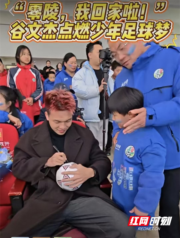 红网时刻新闻1月23日讯(通讯员唐铸波)1月22日,湘超联赛冠军得主、永州本土球星谷文杰应邀莅临零陵区七里店小学,以“足球文化分享+交流签名”的形式开展公益交流活动,为这所全国青少年足球特色学校的师生们带来了一堂别开生面的“足球励志课”,让“永冲锋”精神在校园落地生根。零陵区教育局、区文化旅游体育局相关领导,零陵区社会球迷代表参加了活动。