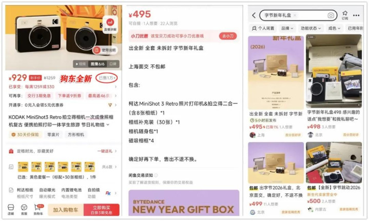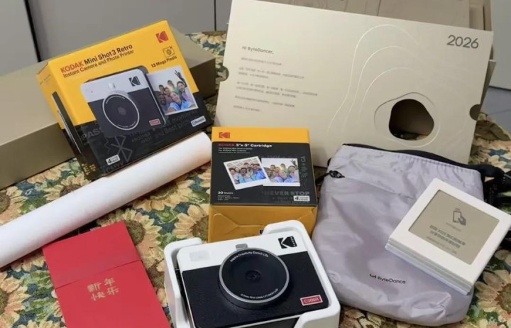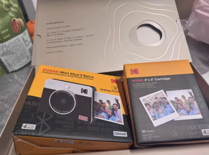本年字节给整体职工派发的礼盒中,包含了柯达Mini Shot3 Retro相机、3英寸一神气相纸、相册随身包、磁吸相框、对子一副、福字2张以及红包封面8张。