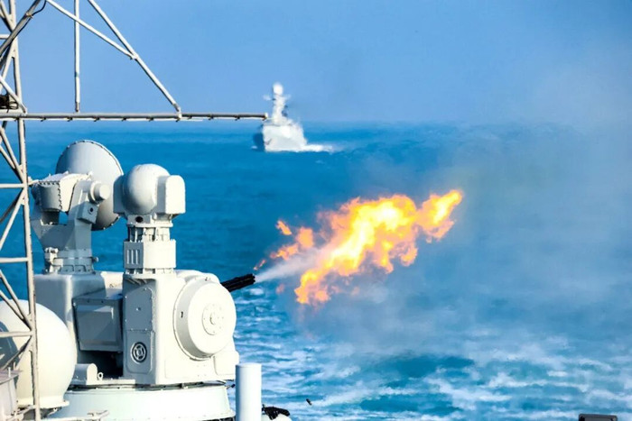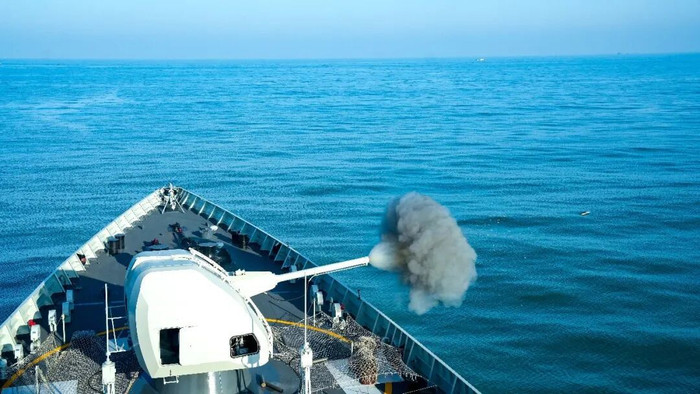 海军济南舰主炮对岸射击。李金彪摄