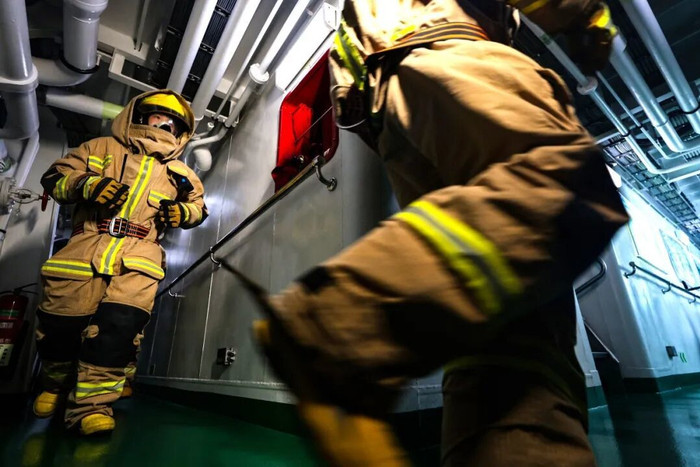 海军济南舰组织损害管制训练。李依阳摄