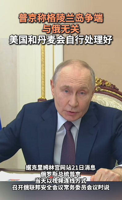 新华社莫斯科1月22日电(记者江宥林)据克里姆林宫网站21日消息,俄罗斯总统普京当天以视频连线方式召开俄联邦安全会议常务委员会议时说,格陵兰岛当前事态与俄罗斯完全无关,美国和丹麦会自行处理好这一争端。