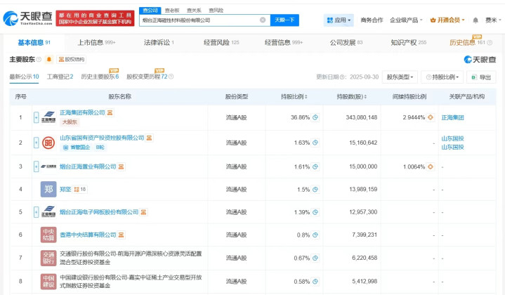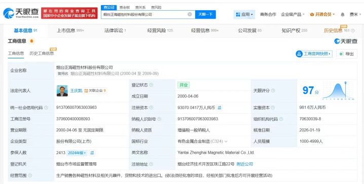 烟台正海磁性材料股份有限公司成立于2000年4月,米兰体育官方网站法定代表人为王庆凯,经营范围为生产销售各种磁性材料及相关元器件,货物和技术的进出口。股东信息显示,该公司由正海集团有限公司、山东省国有资产投资控股有限公司、烟台正海置业有限公司等共同持股。