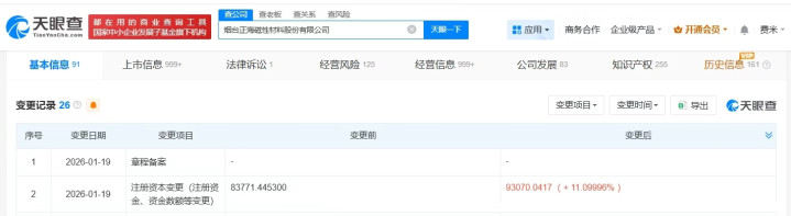 天眼查工商信息显示,近日,正海磁材(300224)发生工商变更,注册资本由约8.4亿人民币增至约9.3亿人民币,增幅约11%。