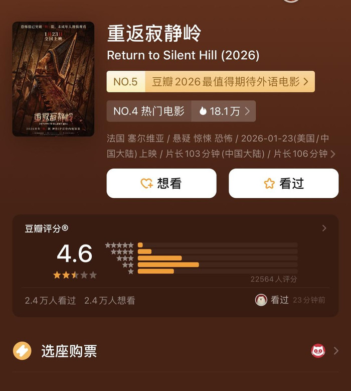 1月23日,电影《重返寂静岭》上映,上映首日票房超过2700万元,成为单日票房冠军,但随后在口碑方面的表现却不尽如人意,在豆瓣的评分仅4.6分,一星和二星占比高达60%,被一些观众认为丢掉了“寂静岭”IP的精神内核与深度。