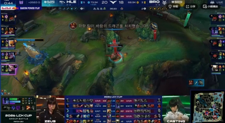 34分钟GIDEON梦魇单人开小龙,HLE直接抱团拿下大龙,GIDEON小龙也不拿了双方乱斗,最终是复活的Gumayusi维鲁斯赶到战场,HLE打出3换4!随后风龙魂继续打团,Zeus纳尔被开极限变大拍到了对手双C!HLE打出1换3拿下风龙魂,从中路一波赢下首局!
