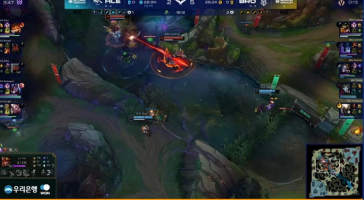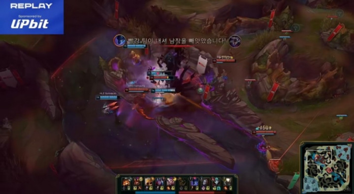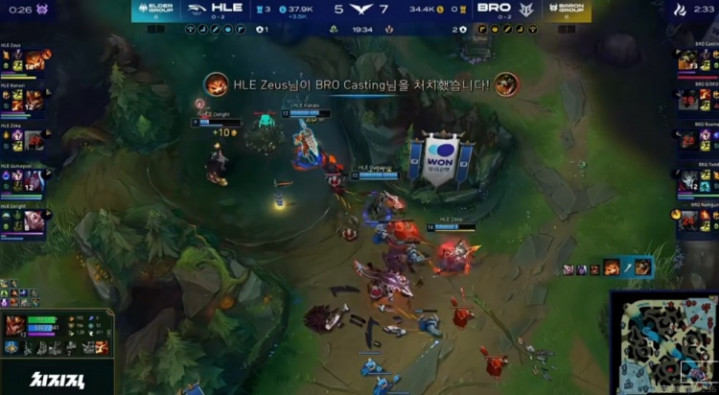 19分钟下路团战BRO想动结果Zeka沙皇有金身啊!HLE支援先到逐个击破,BRO中野倒下之后鳄鱼TP落地被HLE四人拉扯击杀!这波HLE打出1换4,拉开4500经济差!