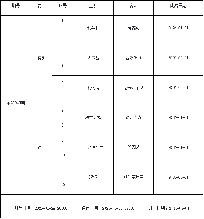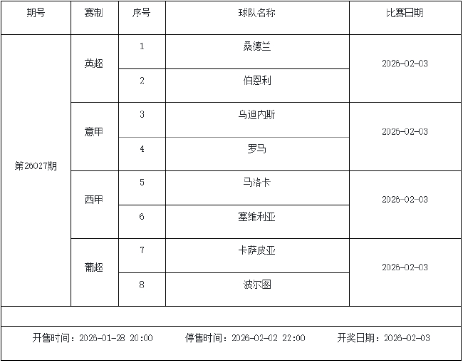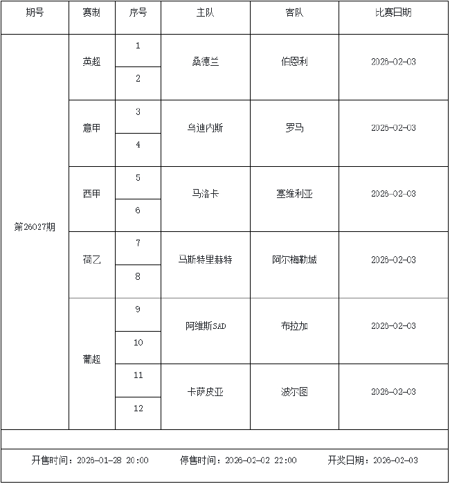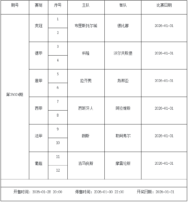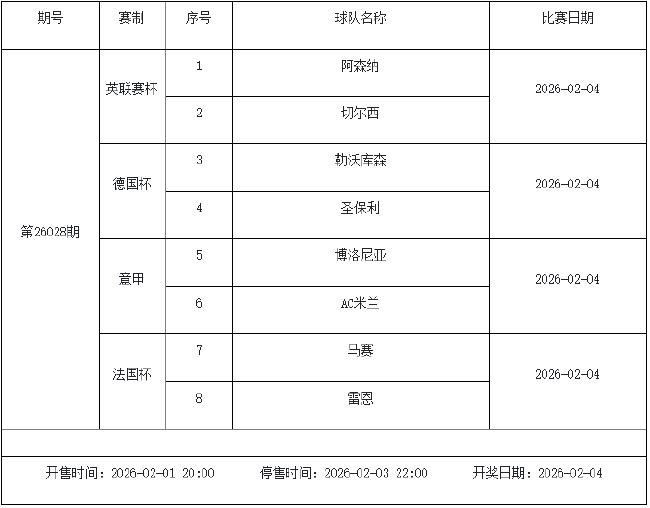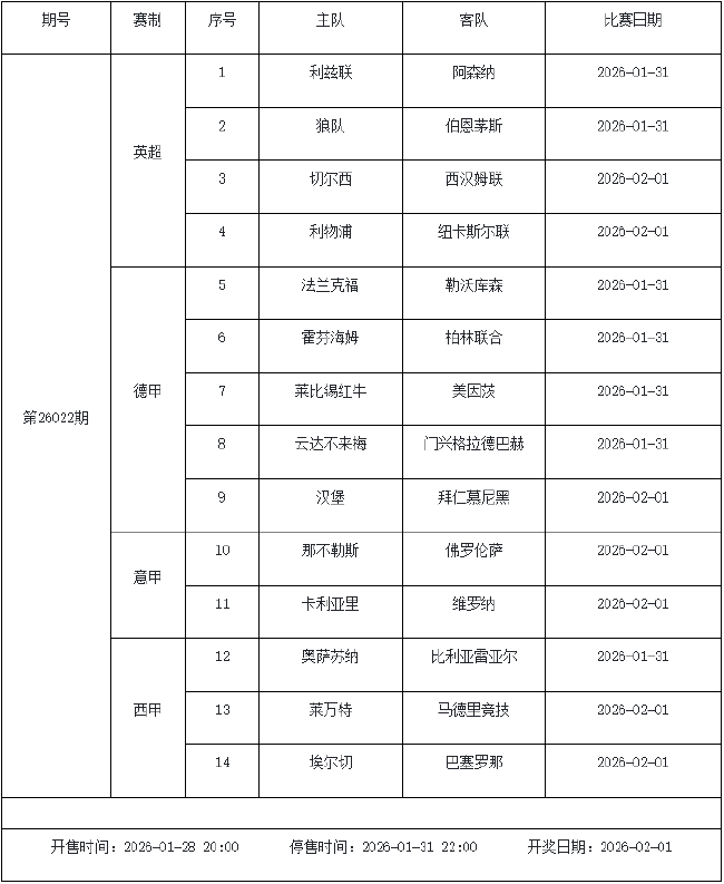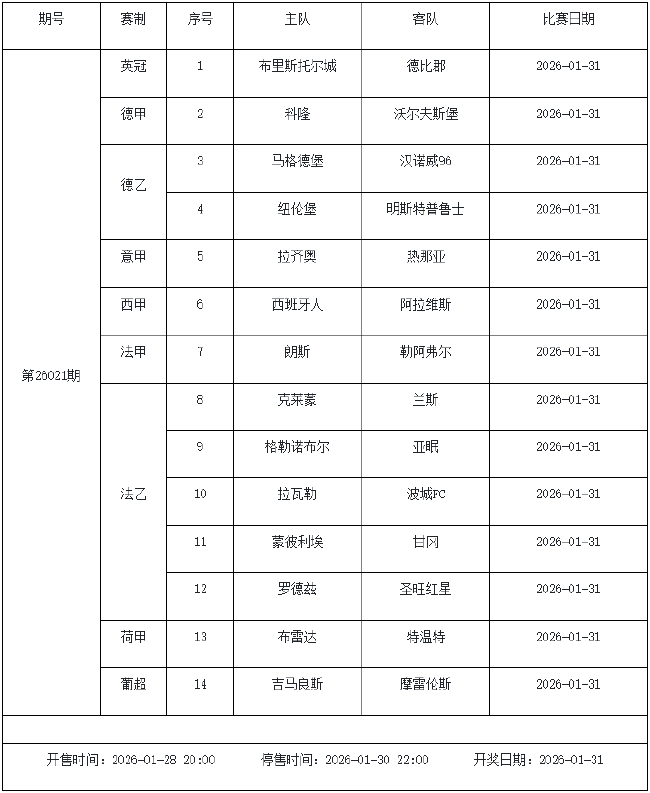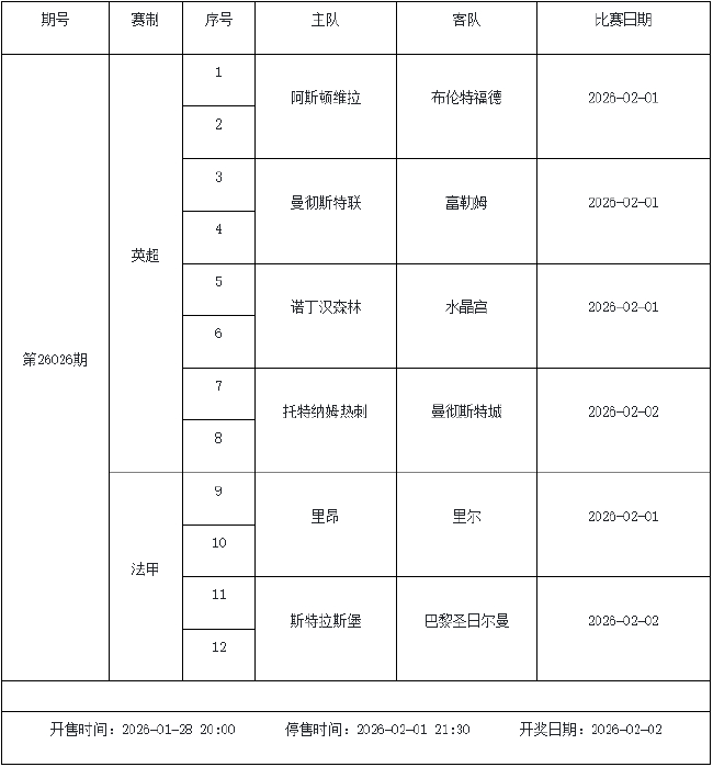 我中心制定了2026年中国足球彩票胜负游戏(14场、任选9场)、6场半全场胜负游戏和4场进球游戏1月30日-2月5日的竞猜场次安排(具体附后),其竞猜对象、开售时间、停售时间和计奖时间均以本文为准。