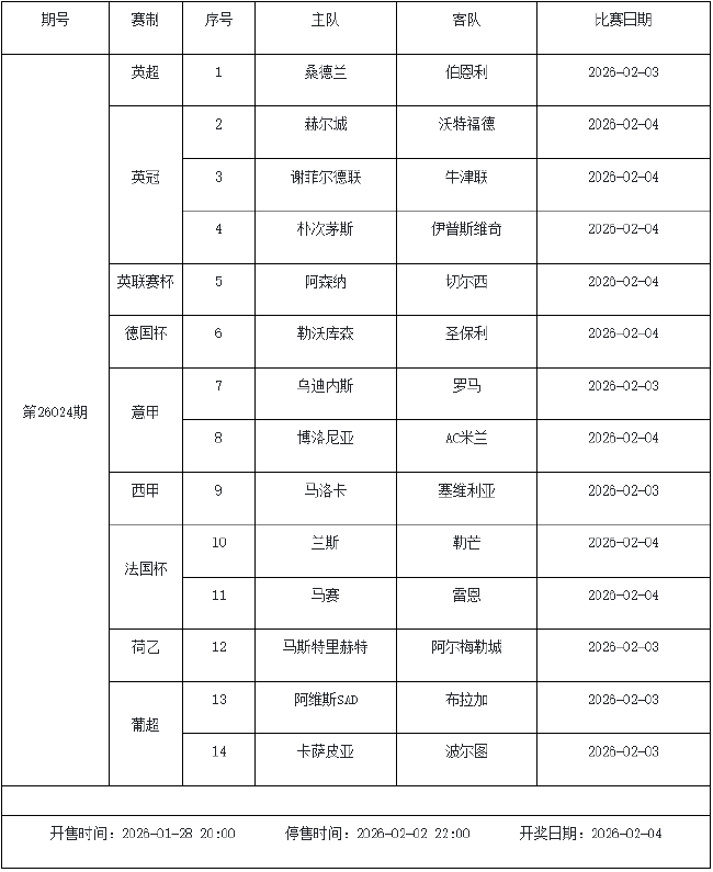 4. 足球彩票胜负游戏(14场和任选9场)第26024期