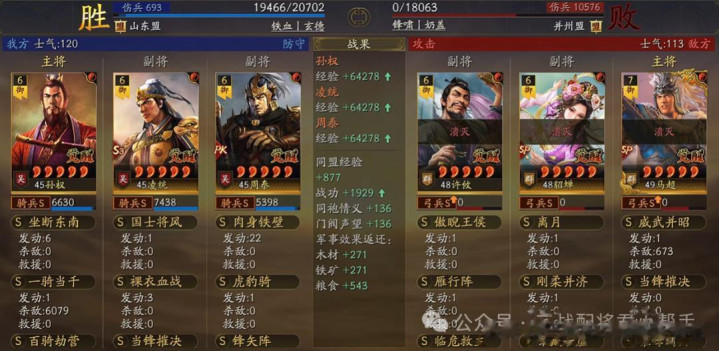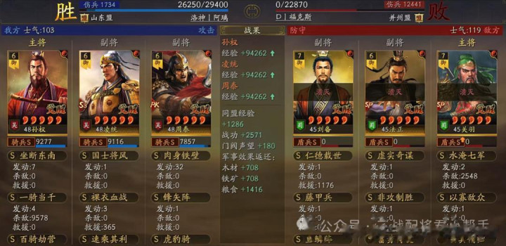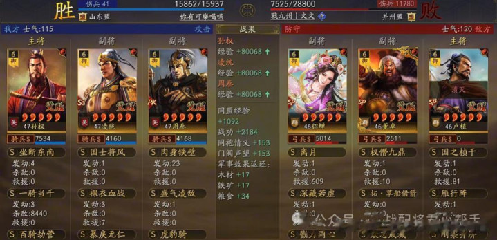 阵容实战总结:作为只打高端局的男人,上面这套拥有高输出爆发的同时,在面对一众主流T0队伍以及满红SP曹操体系都非常的给力!基本上只要孙权的破阵一出,真的是管你有什么减伤高坦度,统统都能给你打残甚至秒杀带走,尤其是打盾兵队伍是最丝滑的,经常就是低损就拿下了对局,哪怕是满红顶配的法官太尉三仙都完全挡不住的那种!