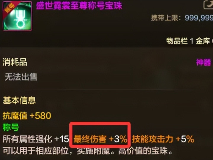 【5】至尊称号宝珠,+3%最终伤害、+5%技攻、+15全属强