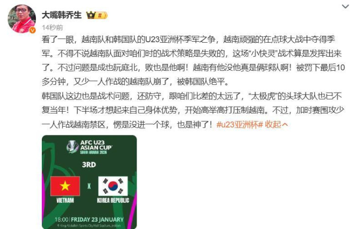 赛后,国内媒体人韩乔生也发表了自己的观点,他认为韩国队在下半场才想起了自己的身体优势,开始高举高打压制越南,不过加时赛围攻少一人作战的越南禁区,一个球都没进,也是神了!