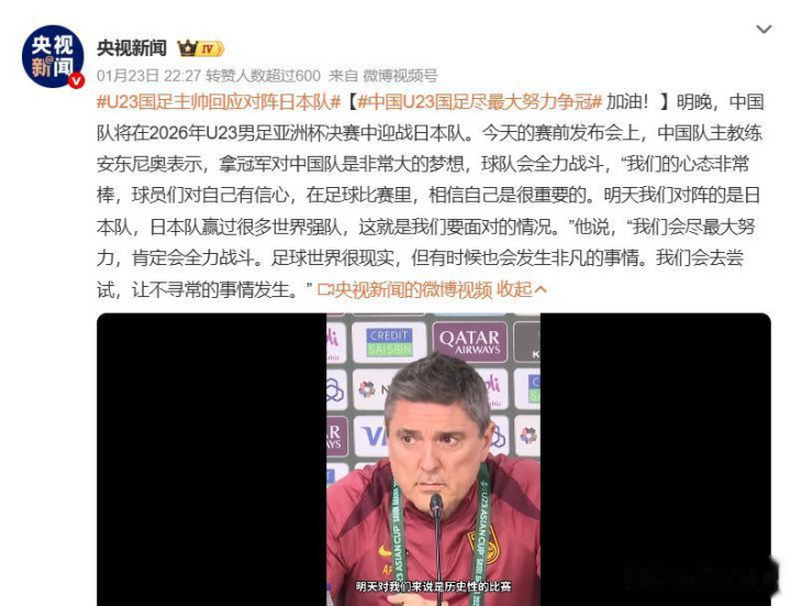 据《央视新闻》报道,国足主帅安东尼奥在接受采访时也放出豪言,将全力带队争夺冠军,球员们对自己都有信心,虽然日本赢过很多世界强队,但国足肯定全力以赴,会尝试让不寻常的事情发生!
